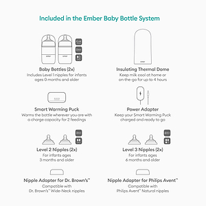 ² Nipple adapter for Dr. Brown’s™ is compatible with, but not limited to, Dr. Brown’s™ Options+™ Wide-Neck nipples. Nipple adapter for Philips Avent™ is compatible with, but not limited to, Philips Avent™ Natural™ and Natural Response™ nipples. Ember is not affiliated with Dr. Brown’s™ or Philips Avent™. Dr. Brown’s™ or Philips Avent™ nipples are not included and must be provided by the customer.